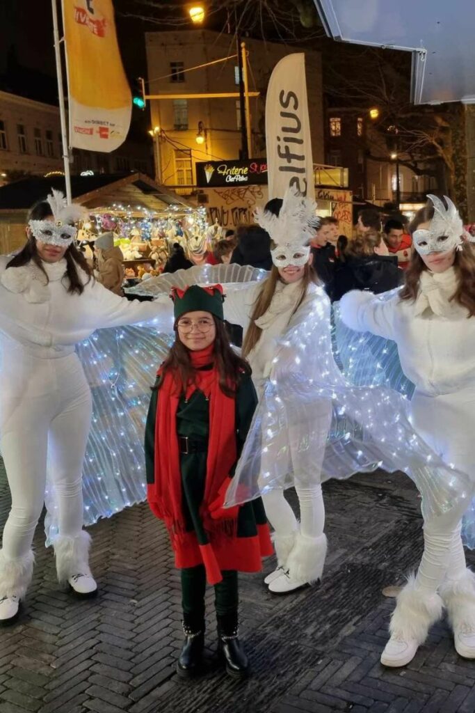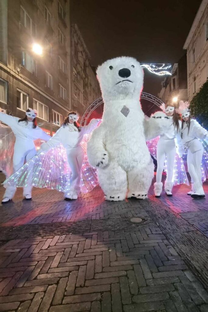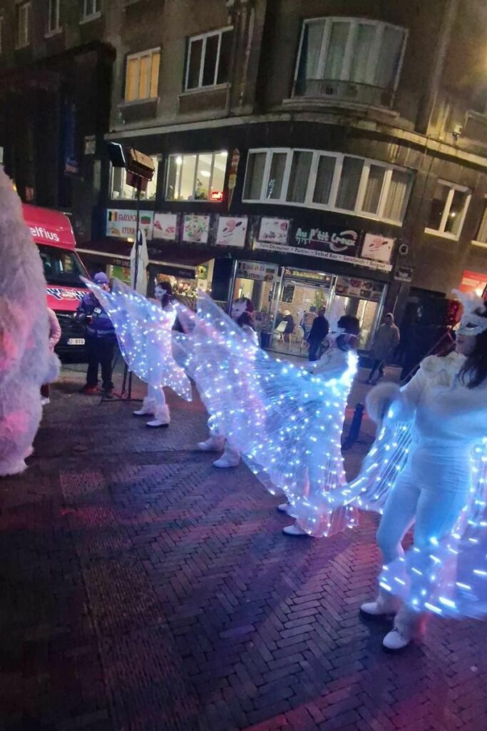 Le 18 décembre, nous étions à St Josse (Bruxelles) avec notre groupe polaire l’ours géant, notre petite lutine pour la distribution de bonbons et nos ailes lumineuses !